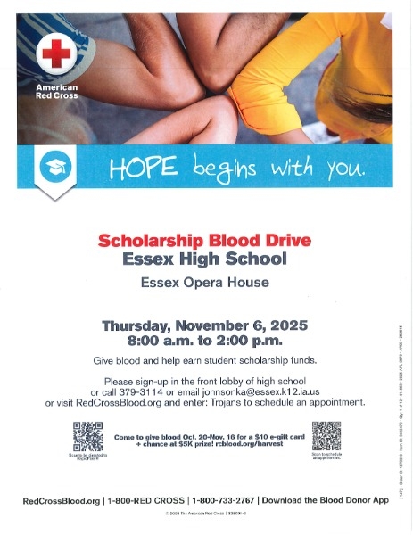 Please join us at the Opera House in Essex, Iowa on November 6th for the NHS Scholarship Blood Drive. Email johnsonka@essex.k12.ia.us or call the office at 712-379-3114 or visit RedCrossBlood.org to set up an appointment.